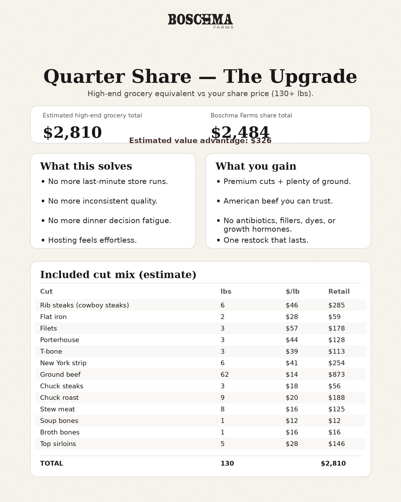 This is a flat-rate share so your experience stays smooth and predictable—no waiting on final weights and no surprise invoices.