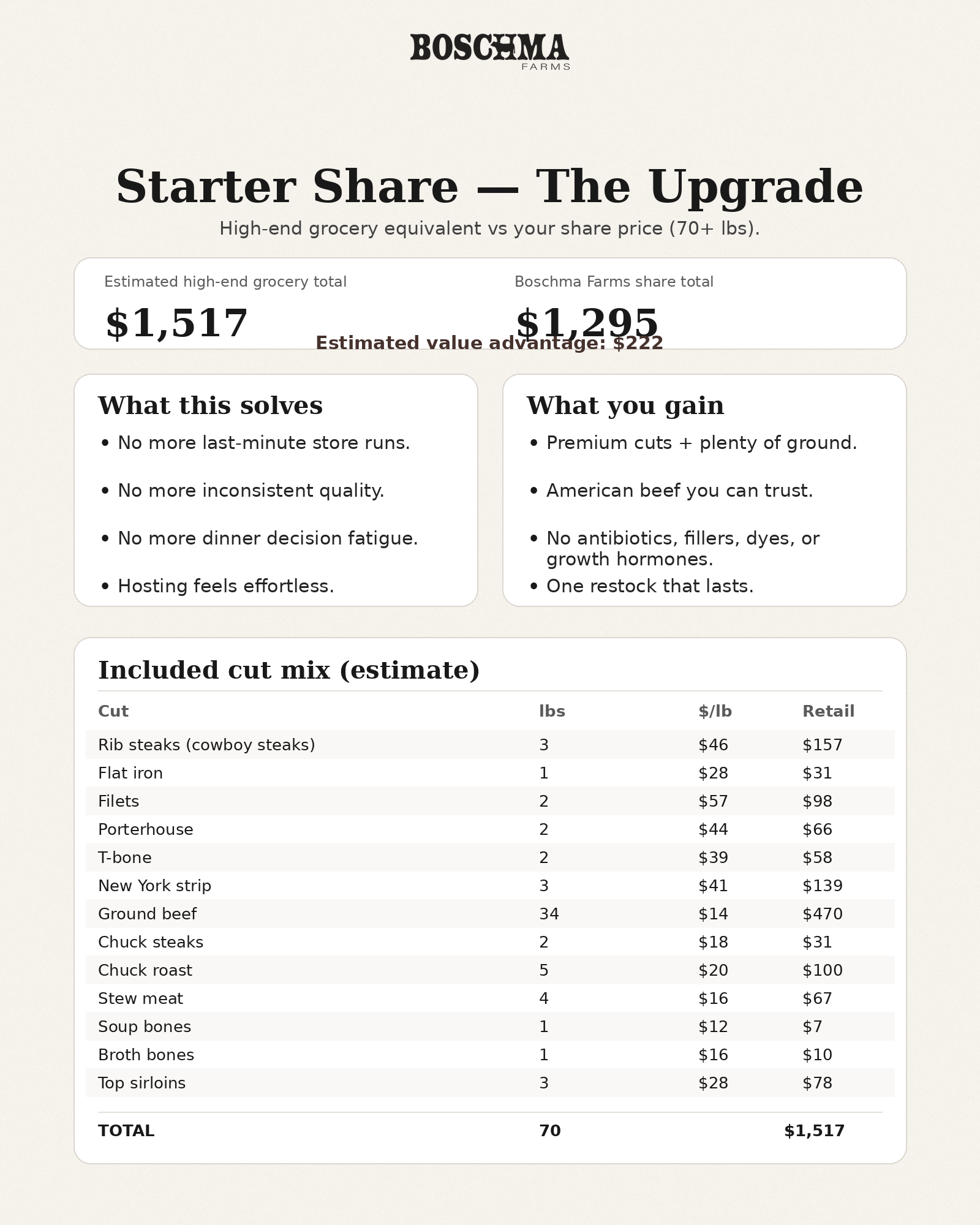 For a family of 4–5 eating beef about three nights a week, the Starter Bundle typically lasts around 6 weeks, depending on portions.