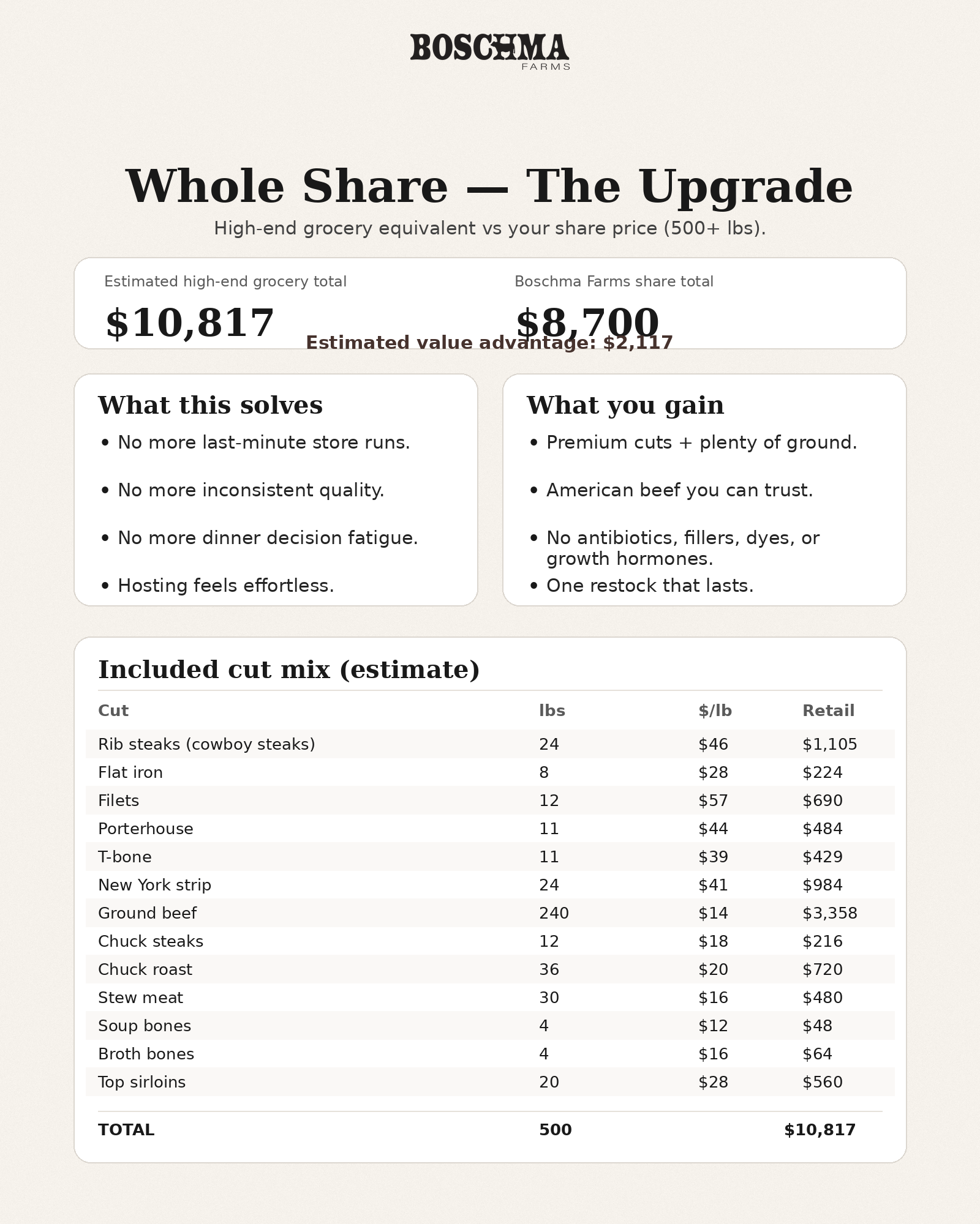 We price the Whole Share as a flat rate, so your experience stays smooth and predictable—no waiting on final weights and no surprise invoices.